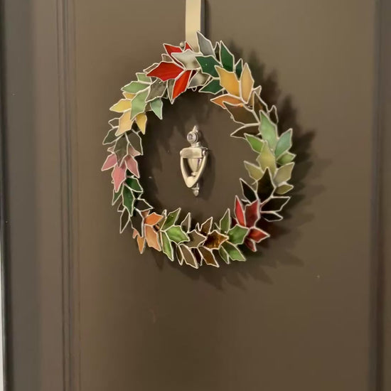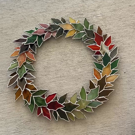 Complete wreath is roughly 13 inches, varying on the positioning of the leaves. The base is a 10 inch stainless steel hoop. Each leaf is on a wire 'stem' that allows them be individually positioned however you desire! Theses ‘stems’ are carefully wrapped & soldered securely in place to the base hoop.